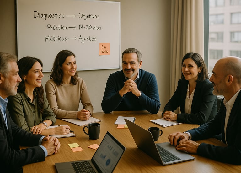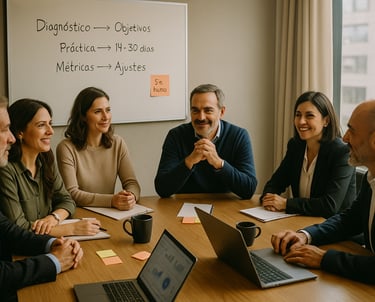 Diagnóstico breve → objetivos simples → práctica aplicada → métricas en 14–30 días → ajustes. Sin humo.